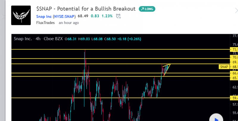 SNAP has recently surged, and is flirting with all time highs yet again. We've been making higher lows after getting rejected off of 69. 40 twice, and are looking to have another retest over the coming days.