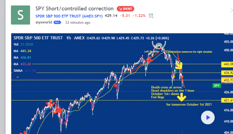 1 hour chart shows one massive head and shoulders , and for tomorrow the Hourly chart also sports yet another Head and Shoulders . more controlled correction coming. I believe in the gap fill theory, what I don't believe in is the flat Earth theory. Fed regulations starting tomorrow is moving this along. every large firm and bank must show 1 trillion in SOLID equity to protect themselves from total failure. This is why we have seen JP Morgan , Goldman Sacks and other institution liquifying their positions. time for the perpetual rising wedge to end and the correction to begin, thou admittedly it started nearing August 20th.