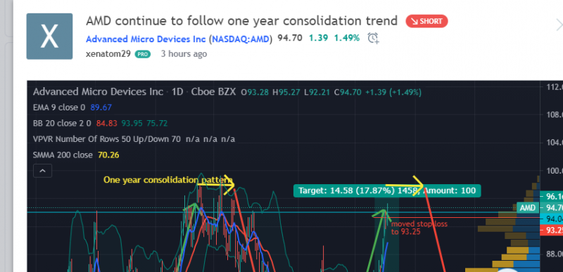 AMD는 지난 1년 동안 일관성을 유지해왔다. 칩 부족은 이 모든 통합을 물 밖으로 날려버릴 수 있습니다. 그리고 저는 이전 패턴을 따라 다시 살펴봐야 합니다. 82.42로 샀는데 95로 스윙을 하려고요. 계획대로 되고 있어서 나는 내 정류장 손실을 93.25까지 옮겼어. 화요일/수요일 12.50의 이익을 얻으려고 합니다. 역전에 따라 또는 AST(99.23)를 초과할 경우 트레이드를 재진입합니다. RSI는 너무 많이 샀어.