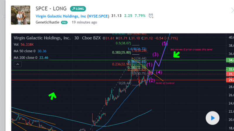 IF, SPCE respects this set up we will see plenty of long opportunities to follow. Looking for confirmation at break of 32. 05 and wave continuation to 34.47, trimming positions at that level as we could see a corrective wave but it could also bust through resistance if momentum and price action is strong. If 34.47 is broken you can expect massive moves, especially with the fundamentals/hype behind this stock with long term targets set at 1.5(57.36)and 1.68(59.54) fib extension of 1st long-term impulse wave. 50/200d moving averages had a strong crossover. I also noticed price bounced off of Volume Point of Control indicating institutional accumulation at the current level.