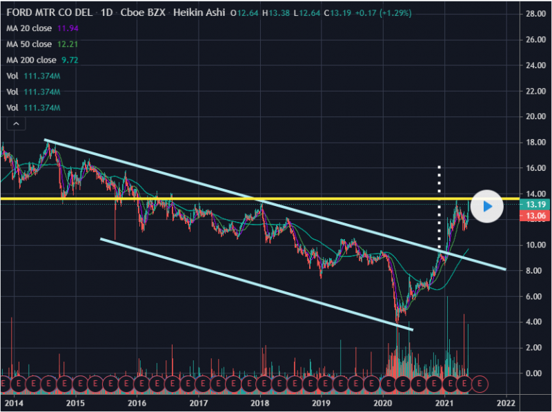 포드는 매우 강한 저항에 있다. 13달러 60센트가 넘으면 그 주식은 16달러까지 오를 수 있다.