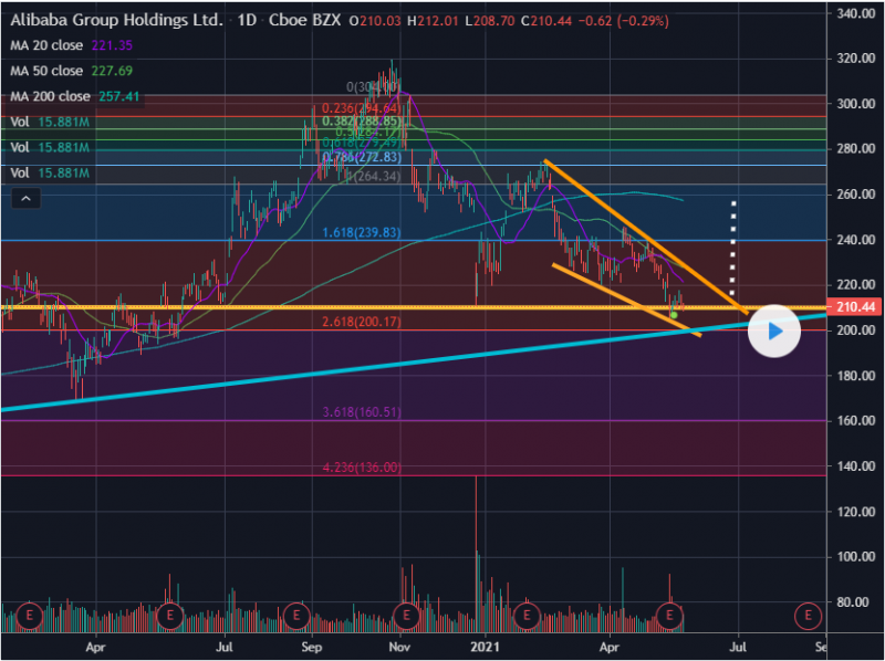 Descending wedge breakout would give BABA a chance to reach 240.