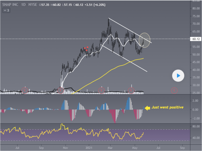 Snap about to break out of descending channel . Just went positive on momentum.
