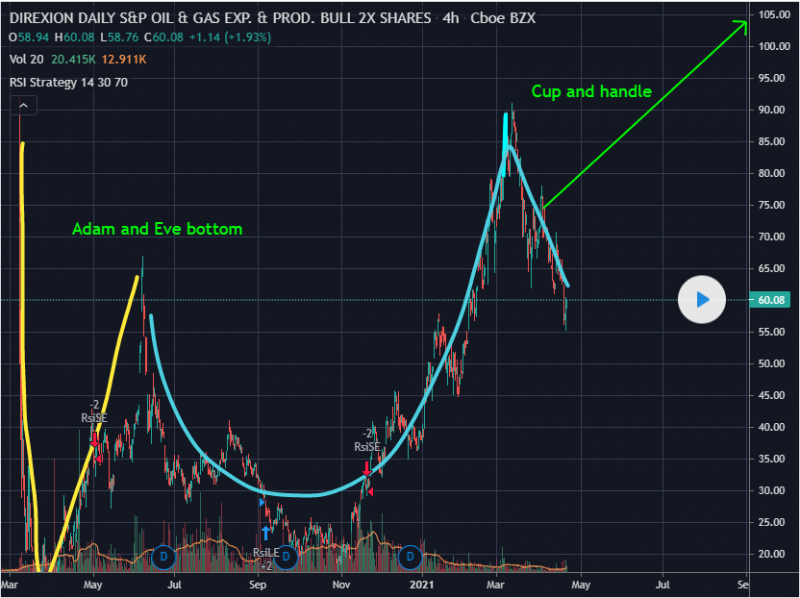 The cup with handle pattern = strong bullish pattern , and the Adam and Eve bottoms support it.