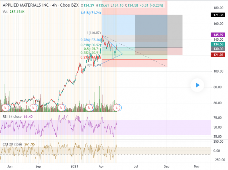 This is a chart of $AMAT on a 4hr candlestick with a Fib Retracement too and the TradingView "Long Position" tool. As you can see, AMAT has just broken out of a pennant . I would wait for a pullback to the $130 level to add shares. If it goes to $125, I will add to my position. Keeping stops tight due to the uncertainty of this choppy and fearful market, I would set it at about the $121 mark right where a Fib line is. This analysis tells me $AMAT may be $171, which would be my PT level for a very successful trade.