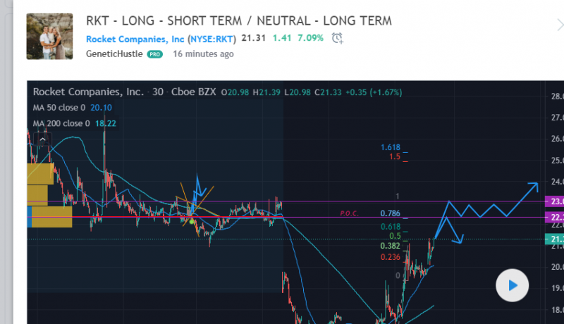 This is just a quick analysis of RKT that im planning to build as I recognize the stocks patterns. Looking like an easy short term target of $22.45. Possible move to $23, 1:1 fib extension of last long swing, i can see it going sideways after it hits that volume channel between 22-23, if it can break above 23.50 we can expect bigger moves. Until then i'll continue building an analysis of it.