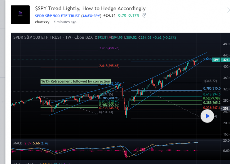 A weekly Long term SPY chart can tell a lot, would not at all consider myself a "bear" but I do think that people should be aware of not only this chart but a lot of the current factors and economic situations we are in right now, from chip shortages, lumber prices, to inflation , the reasons to hedge accordingly against a correction continue to show everyday. Patterns like to present themselves in strange ways.