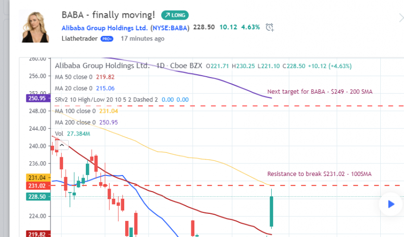 I'm in 10 leaps of BABA. It's been in downtrend and silent for a while, but seems like this baby woke up! There's so much volume and strength, we need to break through the $231 resistance (100 SMA ) and then we're going to continue to another strong resistance $249 (200 SMA ).