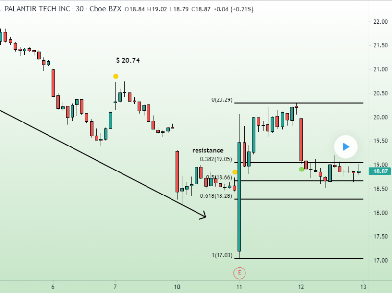 PLTR hit the 50% fibo retracement today, at 18.66, and if it breaks the 20.30 we'll have a bullish confirmation that could take the stock to our target.